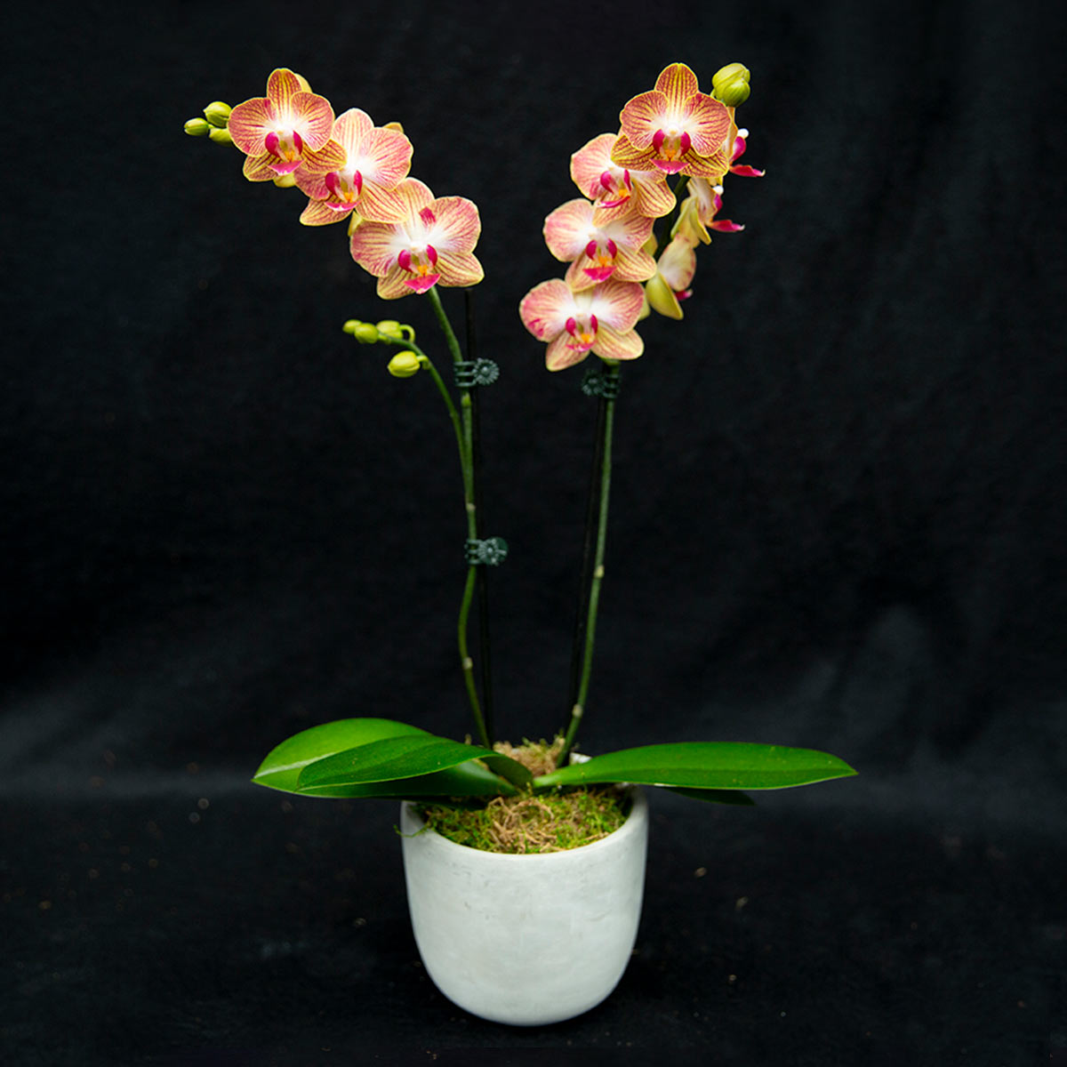 A textual collection of orchids accompanied by stunning moss created by our 7 Day designers. Our elegant planters can be re-purposed, making this the perfect flower gift alternative! Planters and colors may vary based on availability.